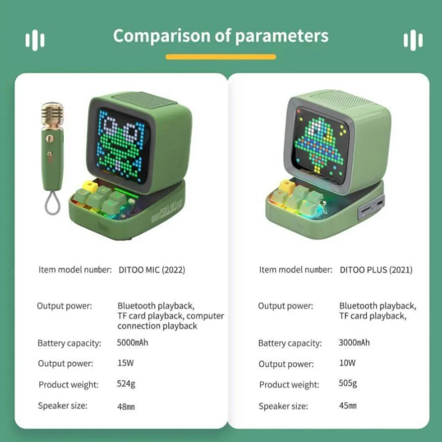 اسپیکر و میکروفون بلوتوثی Divoom Ditoo-Mic با طراحی پیکسلی منحصر به فرد و قابلیتهای متنوع، یه انتخاب عالی برای شماست. صفحه نمایش LED پیکسلی این اسپیکر، به شما امکان میده تا تصاویر و انیمیشنهای دلخواه خودتون رو نمایش بدید و به اسپیکر شخصیت بدید. با وجود ظاهر کوچیک، Ditoo-Mic صدای قدرتمند و واضحی رو ارائه میده. این اسپیکر مجهز به یه میکروفون داخلیه که به شما امکان میده تماسهای تلفنی خودتون رو با کیفیت بالا انجام بدید. Ditoo-Mic علاوه بر پخش موسیقی، امکاناتی مثل ساعت، آلارم، بازی و … رو هم داره.