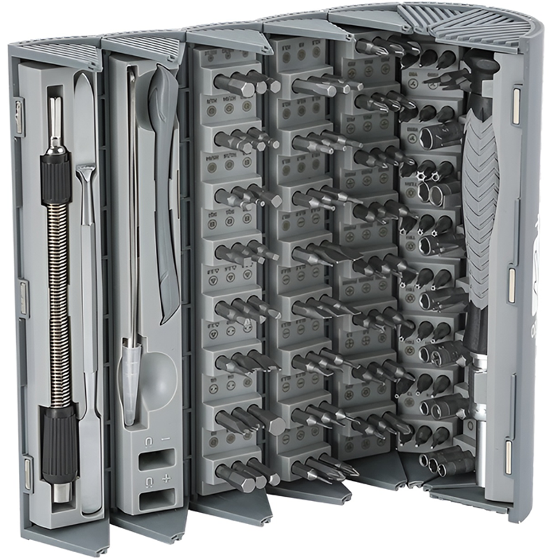 1 عدد بدنه پلاستیکی ABS دسته پلاستیکی (PP+TPR) 122 میلی متری 1 عدد موچین استیل ضد زنگ 115 میلی متری 1 عدد میله نرم فلزی 130 میلی متری 1 عدد ابزار جداسازی فلزی CVR 140 میلی متری 1 عدد ابزار جداسازی POM 83 میلی متری 1 عدد مغناطیس کننده / مغناطیس زدا 1 عدد دارای 120 عدد سری پیچ گوشتی ارزش افزوده : 1 عدد کاور