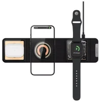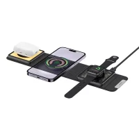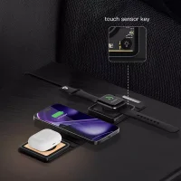 این شارژر بی‌سیم دارای طراحی سه بخشی است که به شما امکان شارژ هم‌زمان گوشی هوشمند، هدفون بی‌سیم (مانند ایرپاد) و ساعت هوشمند را می‌دهد. هر قسمت با دقت بالا برای جای‌گیری صحیح دستگاه طراحی شده تا از لغزش و اتصال ناپایدار جلوگیری کند. این محصول با اکثر دستگاه‌های مجهز به فناوری Qi سازگار است و از شارژ سریع بی‌سیم پشتیبانی می‌کند.