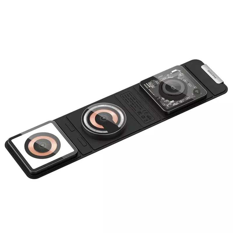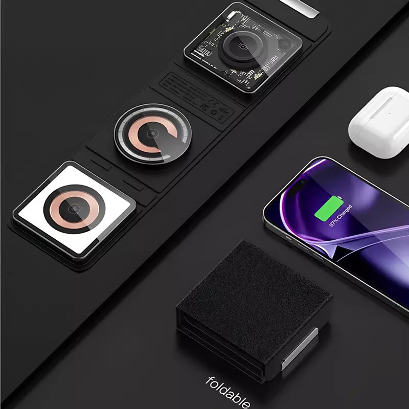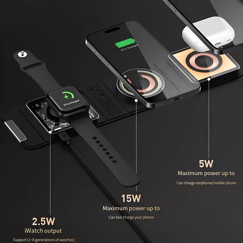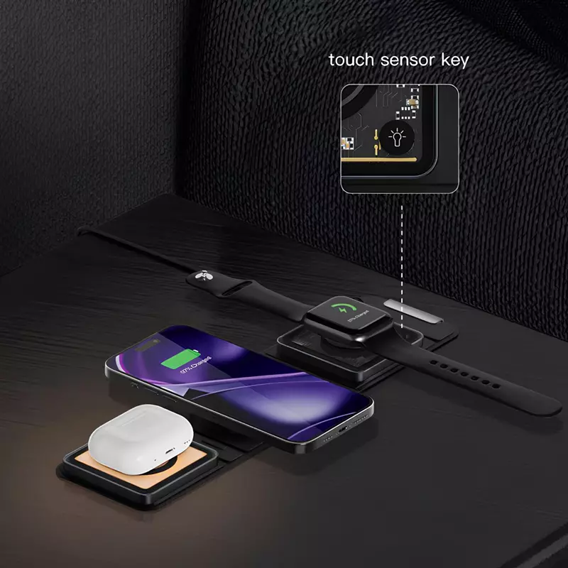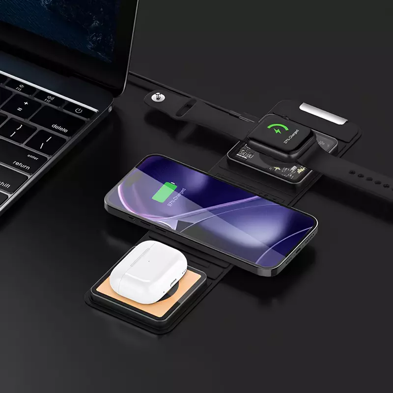 این شارژر بی‌سیم دارای طراحی سه بخشی است که به شما امکان شارژ هم‌زمان گوشی هوشمند، هدفون بی‌سیم (مانند ایرپاد) و ساعت هوشمند را می‌دهد. هر قسمت با دقت بالا برای جای‌گیری صحیح دستگاه طراحی شده تا از لغزش و اتصال ناپایدار جلوگیری کند. این محصول با اکثر دستگاه‌های مجهز به فناوری Qi سازگار است و از شارژ سریع بی‌سیم پشتیبانی می‌کند.