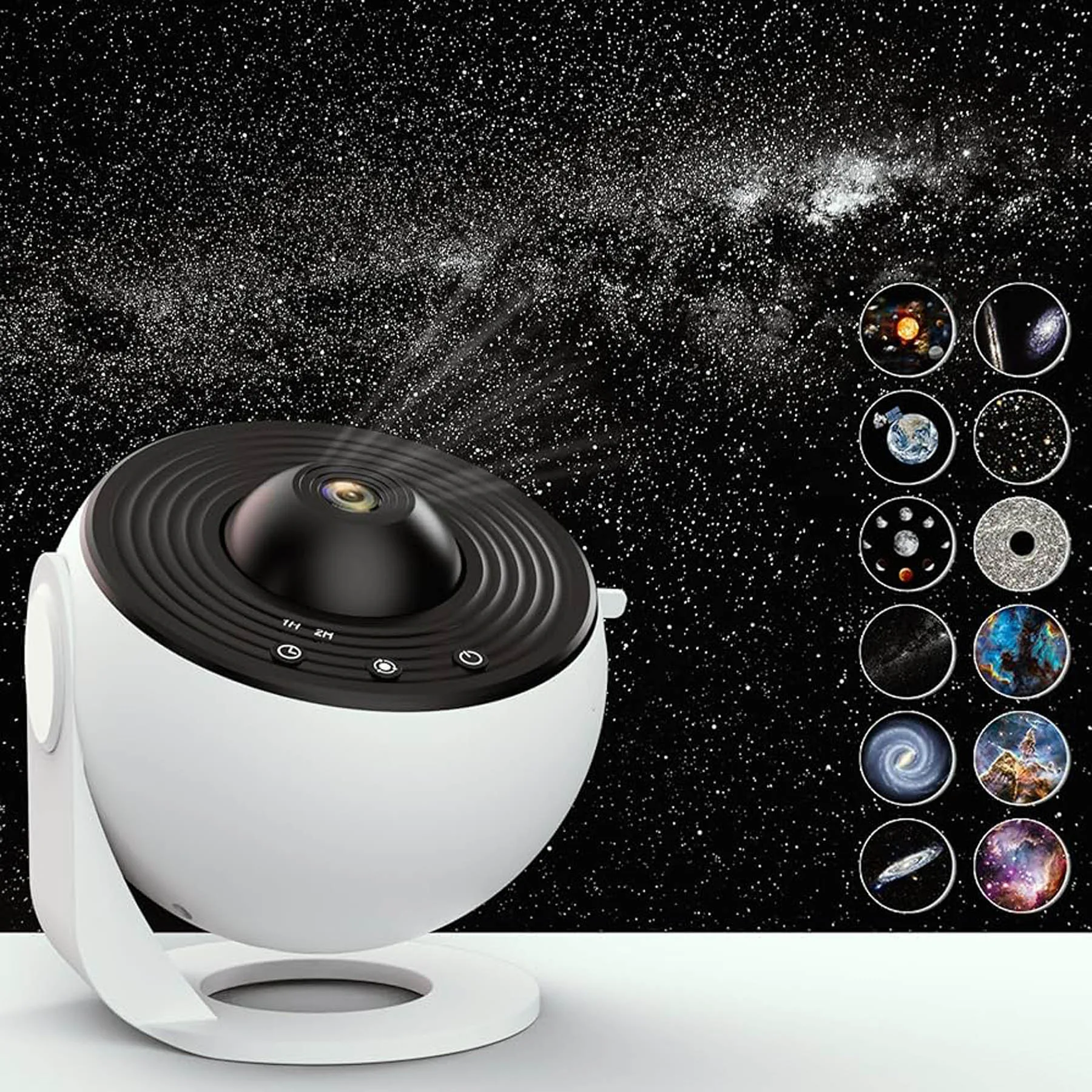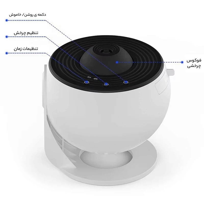 این چراغ خواب با استفاده از لنزهای قدرتمند، تصاویر خیرهکنندهای از کهکشانها، ستارگان و سیارات را بر روی سقف و دیوار اتاق شما پخش میکند. پایه این چراغ خواب قابلیت چرخش 360 درجه را دارد، بنابراین میتوانید زاویه پخش تصاویر را به دلخواه تنظیم کنید. قابلیت بسیار جذاب در این محصول، امکان تغییر تصاویر در حال پخش از طریق تعویض نگاتیو وجود دارد، به این ترتیب که از طریق زبانه کشویی تعبیه شده در کنار بدنه پروژکتور می توان به نگاتیو تصویر در حال پخش دسترسی داشت . نحوه نمایش تصاویر کیهانی به دو صورت چرخشی و ثابت ممکن شده که از طریق دکمه تعبیه شده روی بدنه پروژکتور قابل تنظیم می باشد. مدت زمان روشن بودن دستگاه در بازه زمانی یک تا دو ساعت قابل تنظیم بوده و این موضوع امکان استفاده از پروژکتور به عنوان چراغ خواب را میسر می سازد. طراحی کروی و رنگهای جذاب این چراغ خواب، آن را به یک وسیله دکوری شیک و مدرن تبدیل کرده است. نور ملایم و تصاویر متحرک این چراغ خواب، فضایی آرامشبخش و رویایی را در اتاق شما ایجاد میکند و به شما کمک میکند تا خوابی راحت و عمیق داشته باشید.