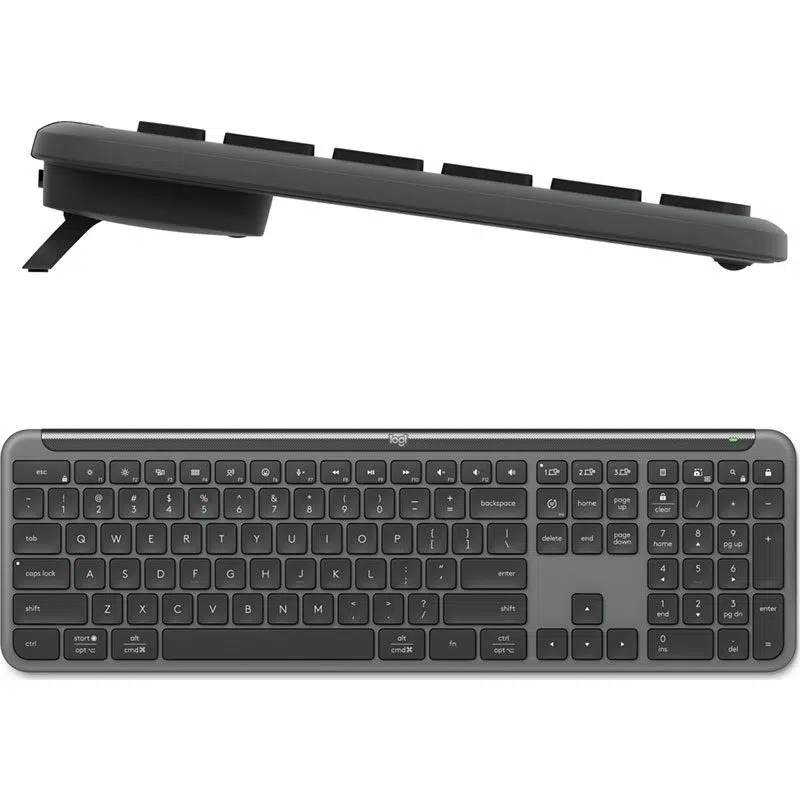 پشتیبانی از دانگل Unify و نرم‌افزار Logitech Options, دارای بدنه آلومینیومی, دارای چراغ‌های نشانگر باتری و Easy-Switch, کیبورد دارای پایه های شیب دار, ماوس دارای کلیک و اسکرول بی‌صدا