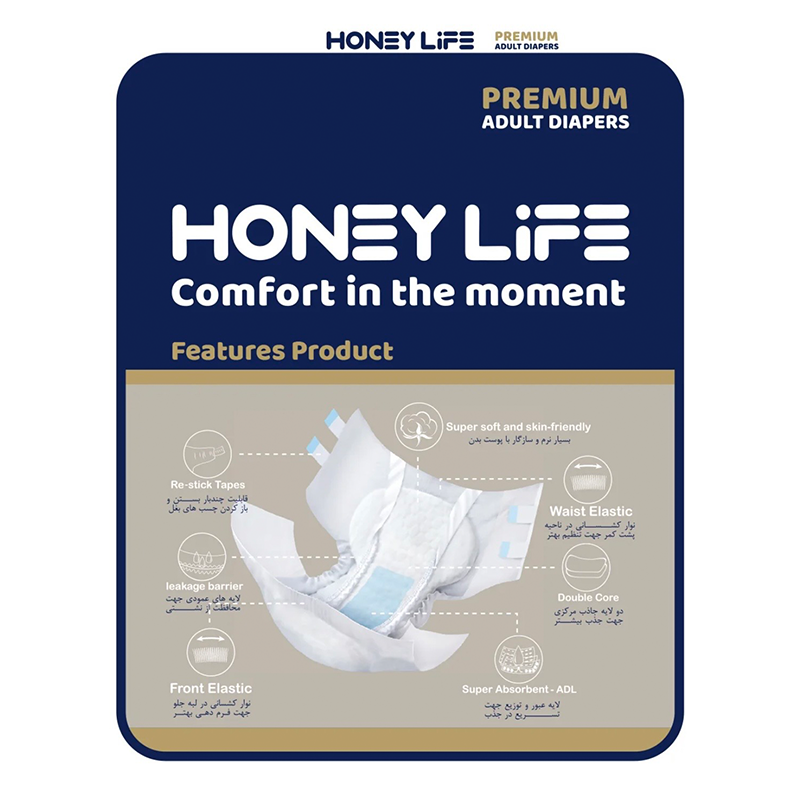 پوشینه بزرگسال Honey Life Premium یک پوشینه کامل چسبی مخصوص افراد بزرگسال است که برای مدیریت بیاختیاری ادرار متوسط تا شدید طراحی شده است. این محصول با بهرهگیری از هسته جاذب دولایه (Double Core)، کشهای جلو و پشت کمر، نوارهای چسبی قابل تنظیم مجدد و لایه فوق جاذب ADL، راحتی، جذب بالا و جلوگیری از نشت را به صورت همزمان فراهم میکند.